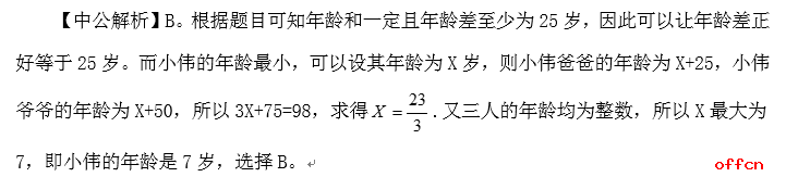 【例4】小伟、小伟爸爸、小伟爷爷三个人的年龄和为98岁,已知三代年龄差每一代至少为25岁,,并且三代人的年龄均为整数,问小伟的年龄最大可以是几岁?