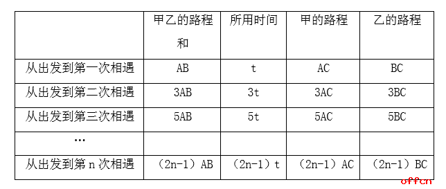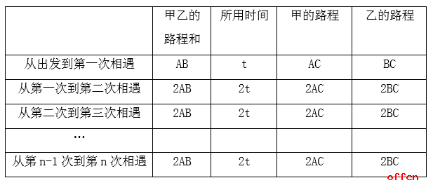结论:从第n-1次到第n次相遇,甲乙的路程和、所用时间、甲的路程、乙的路程均为从出发到第一次相遇的2倍。