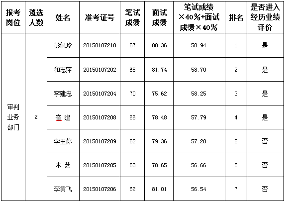 根据《怒江州2015年州级机关公开遴选公务员和参照公务员法管理单位工作人员公告》要求,面试由遴选单位负责实施,现将怒江州中级人民法院公开遴选公务员面试成绩及进入业绩评价人员名单公告如下: