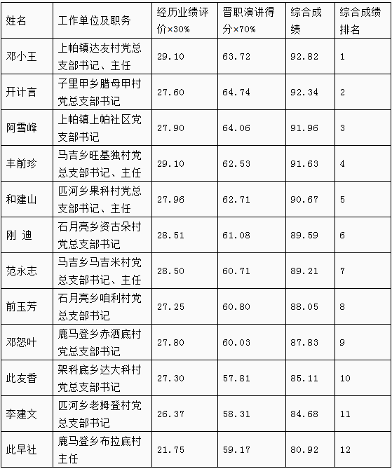 根据《福贡县2016年乡(镇)村(社区)干部选拔进入乡(镇)党委班子实施方案》,3月21日竞职演讲结束。现将邓小王等12名村(社区)干部综合成绩排名公告如下: