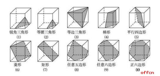 在这里中公教育专家给大家强调一下,正六面体斜截面不会出现以下几种图形:直角三角形、钝角三角形、直角梯形、正五边形。