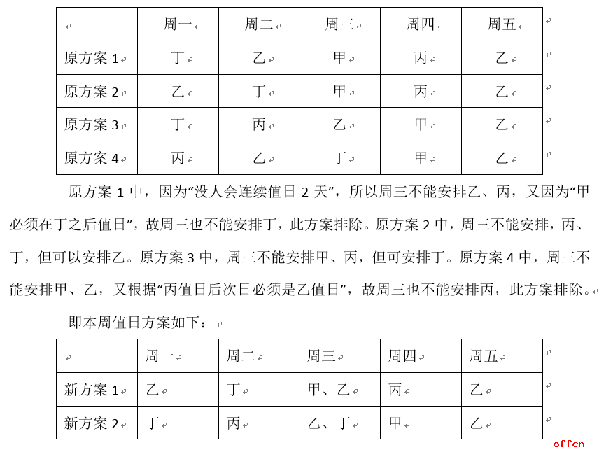 1.【答案】C。根据条件“甲必须在丁之后值日”,可排除A;根据“丙值日后次日必须是乙值日”及“乙在周五值日”,可知如果丙在周一、周三值日,则周二,周四,周五都为乙值日,不满足“每人每周至少值日一次”的要求,排除B;根据“乙在周五值日”,及条件②可知,甲不在周二值日,排除D;又因为“甲必须在丁之后值日”,则甲在周三或者周四值日。