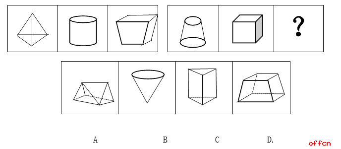 我们观察上面这道图推题目,首先看到的就是题干和选项都是立体图形,那么他们之间有什么规律呢?我们脑子里先过一遍,比如:边的数量、面的数量、面积、是否含有直线曲线等……,发现都不是,这里就涉及到比较少见的一个规律了,叫:重心。
