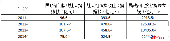 2011~2014年社会捐赠款和社会捐赠衣被情况