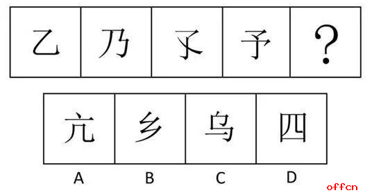 中公解析:题中文字的笔画数分别为1,2,3,4笔为等差数列,因此答案文字的笔画数为5笔即可,选项中只有D选项的“四”字是5笔画。因此,本题答案为D选项。