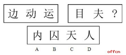 中公解析:考察规律叠加里面的去同存异,类比性前三幅图中,前两幅图去掉了去掉相同的部分“力”,保留不相同的部分并且叠加成一个新汉字“运”;同理第二段图形,去掉相同的部分“二”,保留不相同的部分,一个图形的“口”,第二个图形的“人”,叠加在一起得到新汉字“囚”,故答案选B。